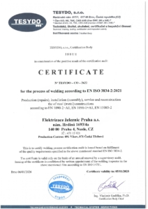 - We also hold a certificate for the welding process according to the ISO 3834-2 and for implementation of steel structuctures according to EN 1090-2 for the version class EXC3, and we also hold a Certificate of conformity of the factory production control according to EN 1090-1+A1.